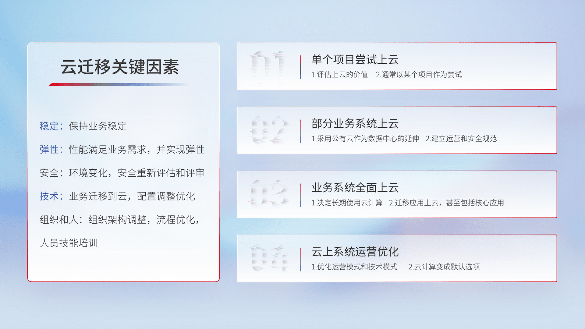 结合实际业务,,,,从规划设计、、云平台选型、、、云原生改造、、、、数据迁移、、集成交付,,迁移全过程为客户识别最佳上云路径,,做好风险识别管理,,设计网络架构、、、身份权限、、、、安全审计合规、、操作审计、、、、日志审计、、监控告警策略、、、、多站点容灾设计等,,对云上基础设施进行整体规划,,提升IT治理水平,,,以满足弹性、、高可用、、高性能的需求。。。。