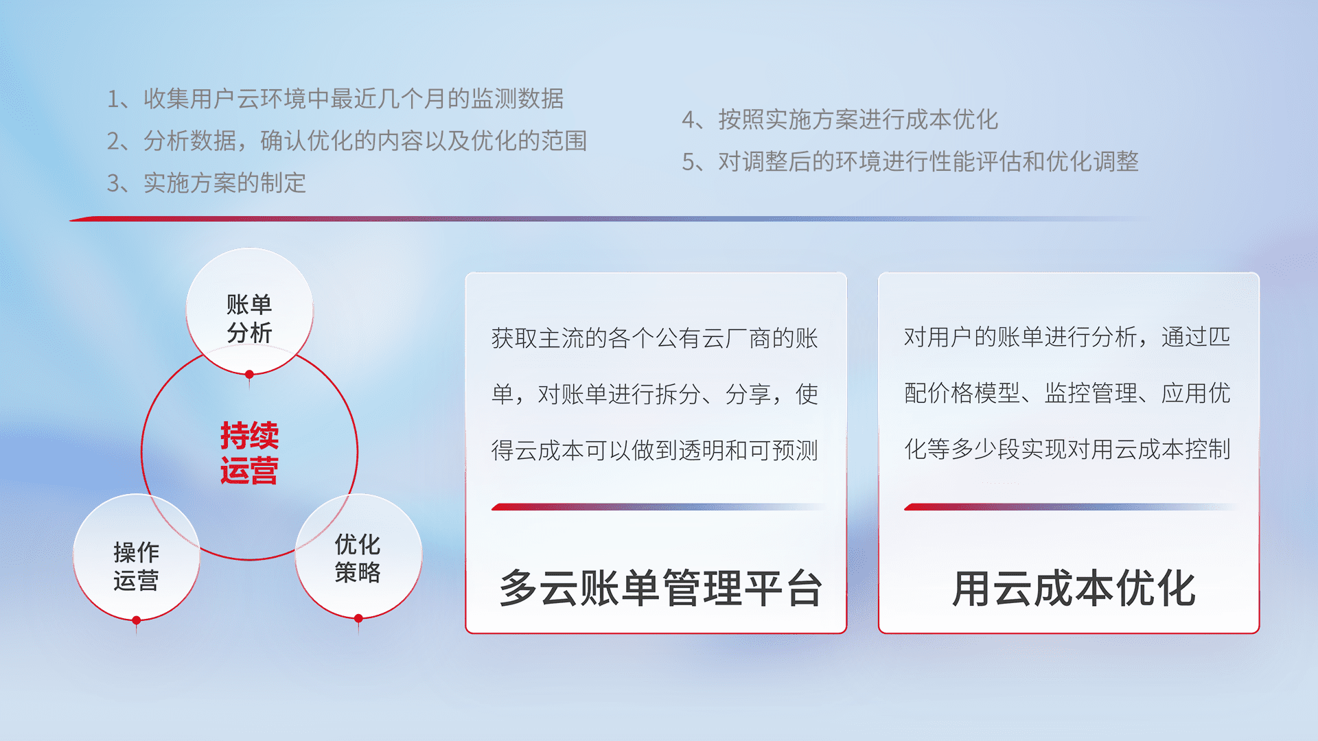 通过多云纳管,,以统一的资源数据模型把客户的云资源进行抽象和封装,,进而实现对多云资源的统一操作,,,保障云资源管理的可靠性、、、稳定性与可用性。。。量身定制化运维内容,,,,配置、、、开发运维、、、补丁管理、、备份、、、监控、、、、认证和访问管理、、、审计和日常巡检等,,保障在用云过程中的可靠度,,,,稳定度以及高可用率。。。。